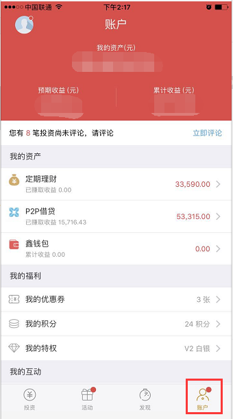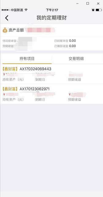 账户上方会显示“我的资产”显示的是在计息的投资本金及利息的总和,“预期收益”显示的是未到期投资的预计到期收益,“累计收益”显示的是已经到期回收的投资为您赚取的收益。
