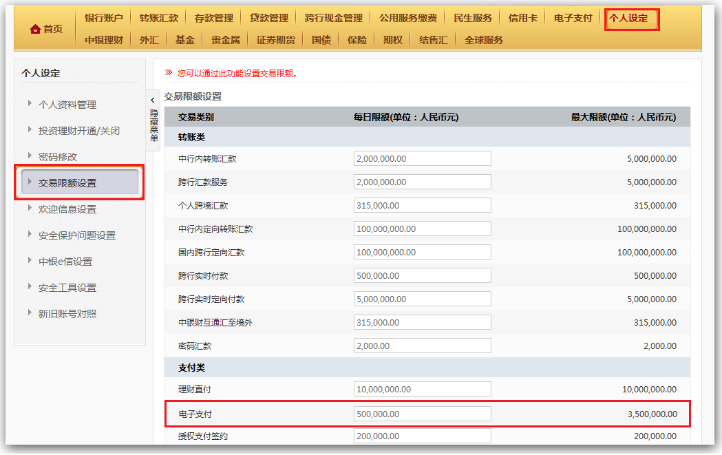 修改“交易限额设置”一栏中的“电子支付”每日额度,点击确定即可。