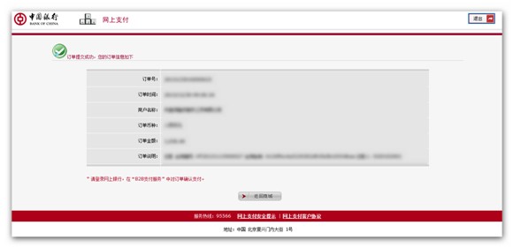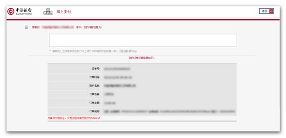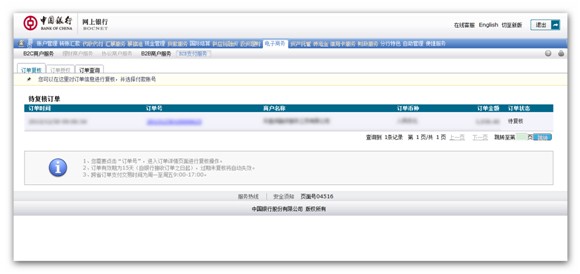 (2) 登陆中国银行网上支付,确认对应的订单,如下图: