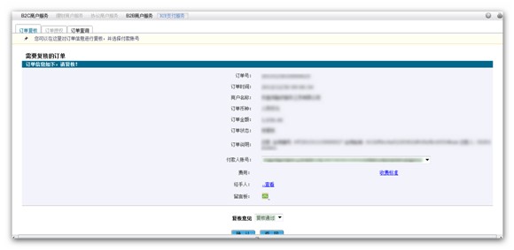 (4)登陆中国银行网上银行,对该笔支付进行复核操作。登陆后,在[电子商务]->[B2B支付服务]->[订单复核]中可以看到对应的待复核订单,如下图:
