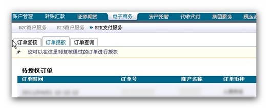 (6)复核成功后,登陆中国银行网上银行,对该笔支付进行授权。在[电子商务]->[B2B支付服务]->[订单授权]中可以看到对应的记录,对其进行授权: