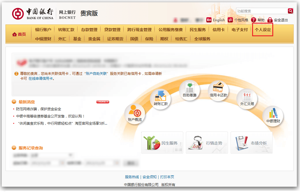 您需要更改网上支付的额度以满足您在开金中心投资支付的要求:登录网上银行后,在首页点击“个人设定”设置。