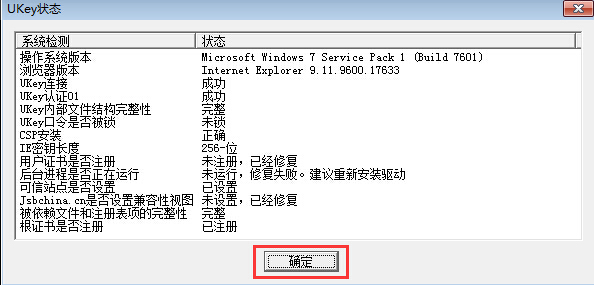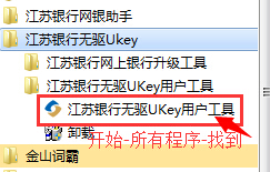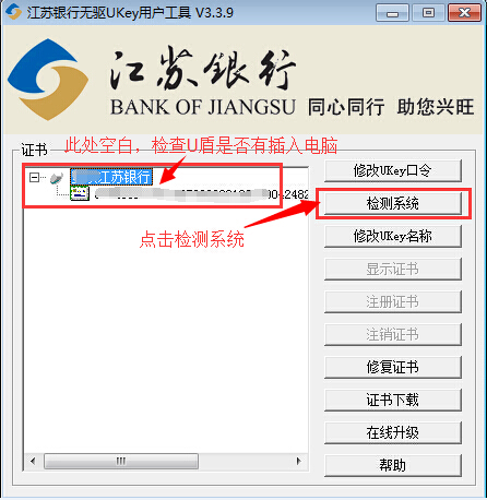 解决办法:请在您电脑的“开始->程序”中找到”江苏银行无驱UKey用户工具”并运行,输入UKey口令后选中左边的证书项,点击“注册证书”。此后再重新插入UKey即可解决。如果仍存在问题,也可点击下图中的”检测系 统”,查看是否有错误提示。确认没有错误后,关闭浏览器重新打开并进入江苏银行主页,可解决此问题,如下图所示: