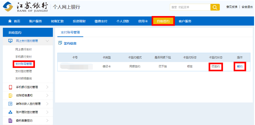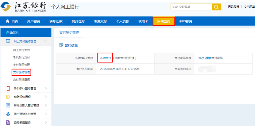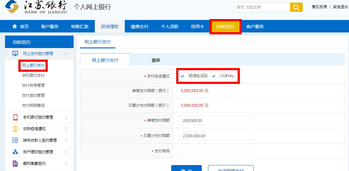 解决办法:请登录江苏银行网银,如下图所示在自助签约->网上银行支付->支付账号管理安全模式选择短信验证码+USBKEY,进行签约,并在支付账号管理中选中您的网银支付卡并点击“签约“。签约成功后,您可以回到开金中心网站重新支付。