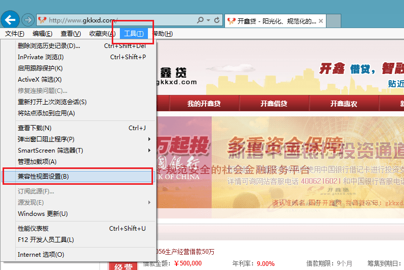 请将开金中心网站加入到兼容性视图列表,按键盘Alt按键,点击浏览器上方菜单栏的“工具”,向下找到“兼容性视图设置”,点击进入以后,将kaifae.com加入到兼容性视图网站中。