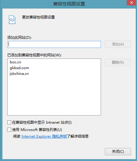 如果您绑定的是江苏银行银行卡,请同时将jsbchina.cn也加入到兼容性视图网站中;如果您绑定的是中国银行银行卡请将boc.cn加入到兼容性视图网站中。(两个同时添加也没有问题)
