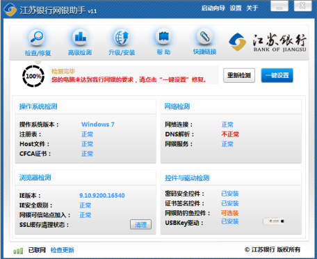 3)安装并执行“江苏银行网银助手”,在网银助手中执行“重新检测”和“一键设置”功能确保系统中的各项配置达到控件要求。