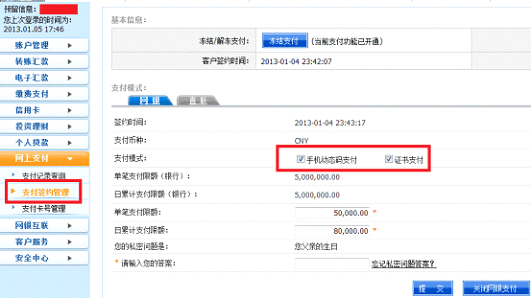 解决办法:请登录江苏银行网银,如下图所示在 网上支付->支付签约管理->网银 中开通网银支付,并设置您需要的支付限额。设置成功之后请再确认下面的”支付卡号管理”中,在开鑫贷上绑定的银行卡已处于签约状态。如果银行卡已经处于已签约状态,您可以回到开鑫贷网站重新支付,否则您还需要将银行卡进行签约。