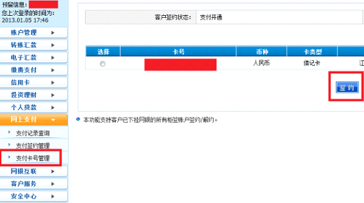 解决办法:请登录江苏银行网银,如下图所示在 网上支付->支付卡号管理中选中您的网银支付卡并点击“签约“。签约成功后,您可以回到开鑫贷网站重新支付。
