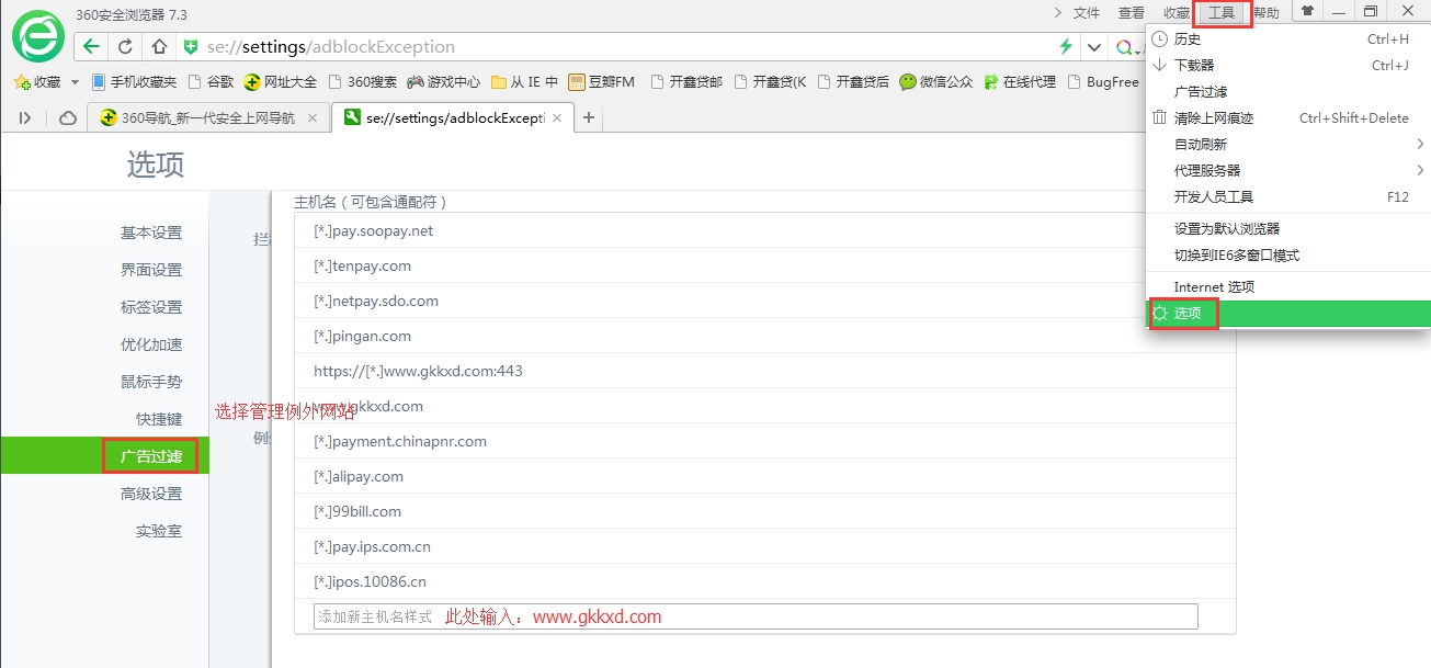 2、如截图:点击菜单栏“工具”下“选项”菜单,设置“广告过滤”中的“管理例外网站”,添加www.kxjf.com 即可。