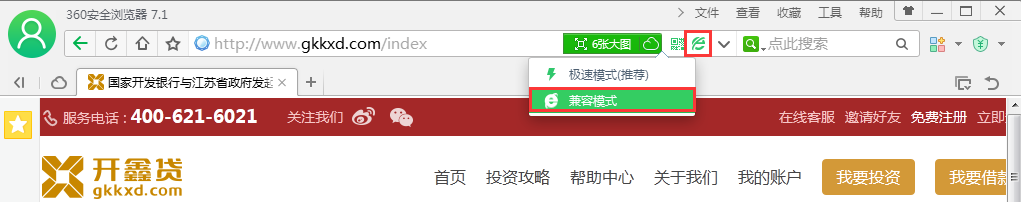 1、请点击红色方框中的“e”图标,选择兼容模式。