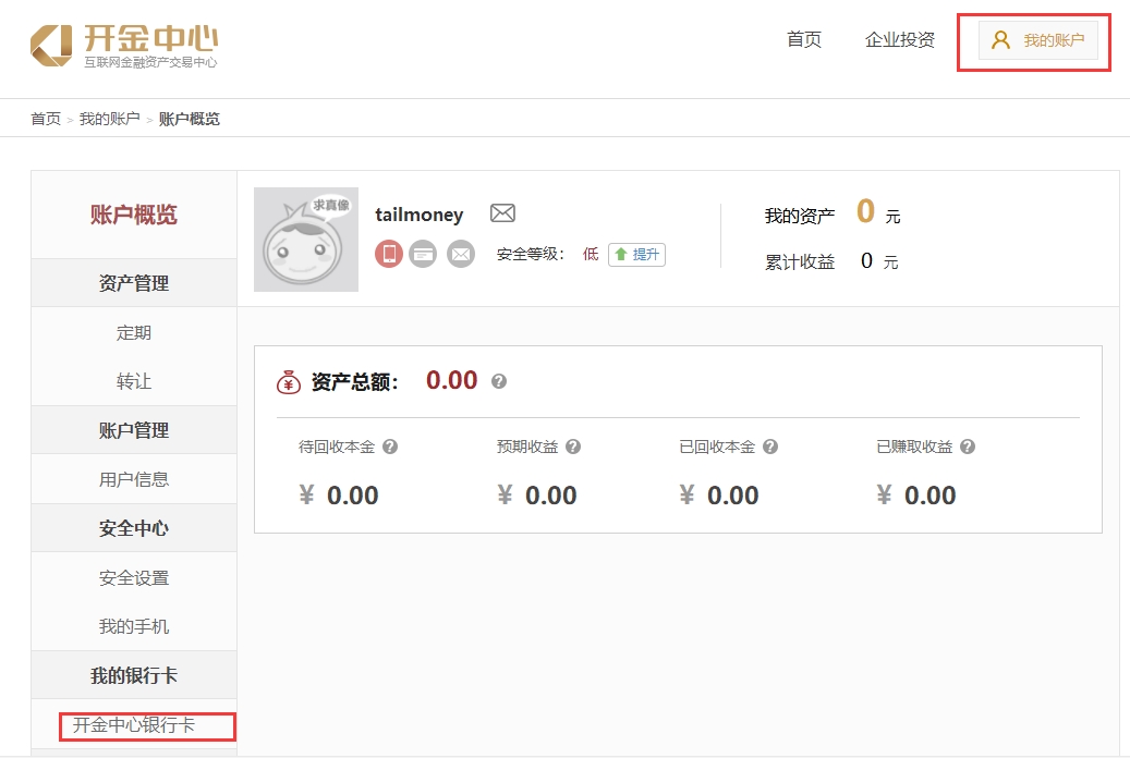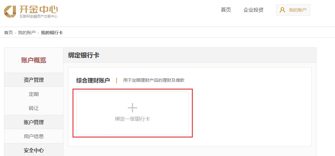 2.申请绑卡成功后点击我的账户-开金中心银行卡,并点击“绑定一张银行卡”