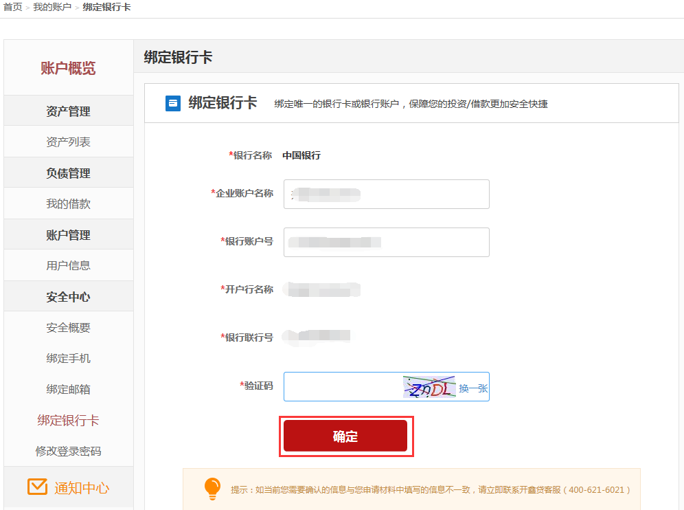 3.输入企业账户名称、银行账户号、开户行名称,验证码,点击【确定】