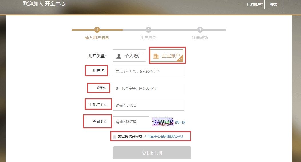 2.点选企业用户,填写用户名、密码、手机号码、验证码,勾选”我已阅读并同意《开金中心会员服务协议》“ 点击【立即注册】